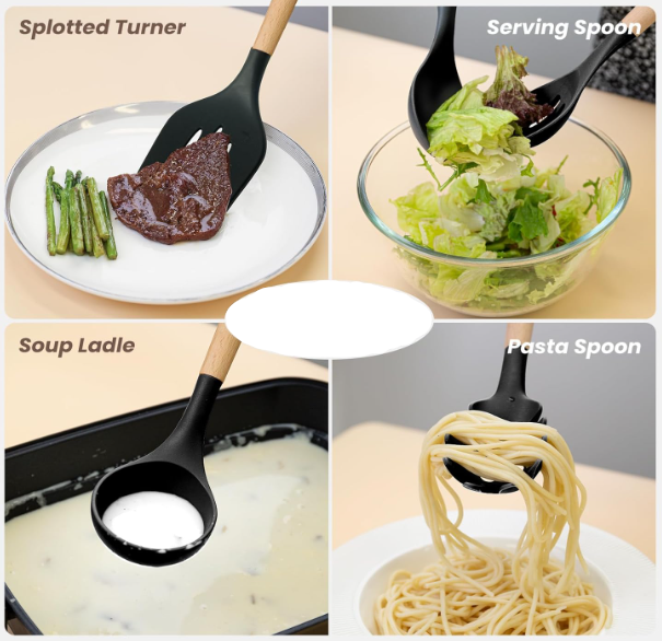 - The shape and premium wood handle of the silicone kitchen utensils in this set are ergonomic. It also protects against rust and scald. If you tackle all the recipes you can find and are always in the kitchen, you deserve this set.