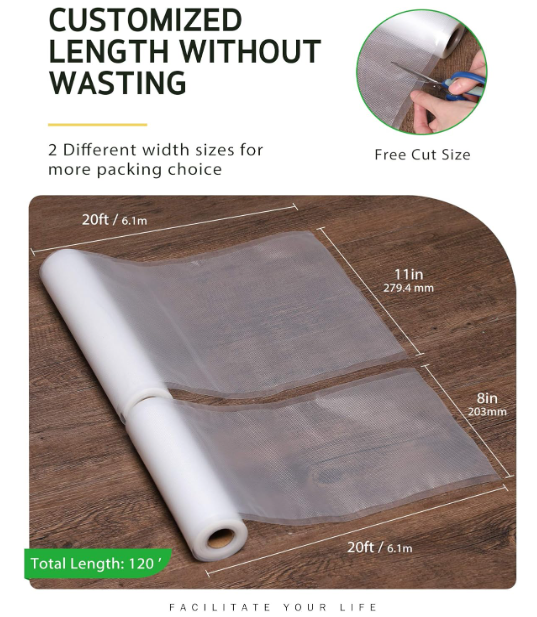 - Our package includes 3 rolls of 8″ x 20′ and 3 rolls of 11″ x 20′ (totaling 120′), providing you with versatile options to accommodate different food sizes.