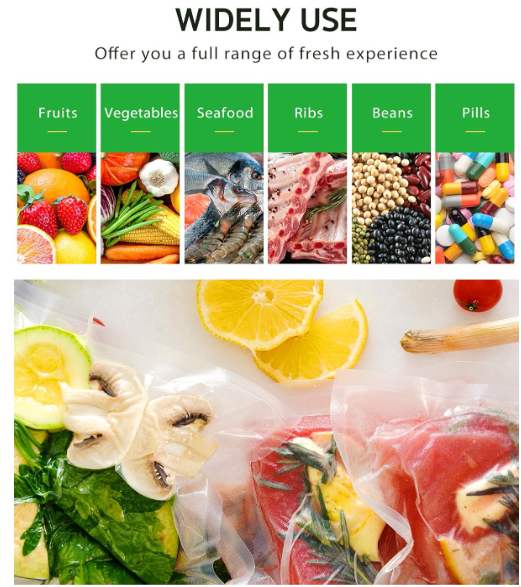 - Our vacuum sealer bags preserve the nutrition and extend the shelf life of a wide variety of foods. Perfect for storing vegetables, seafood, ribs, and beans, these bags help you manage your food storage efficiently.